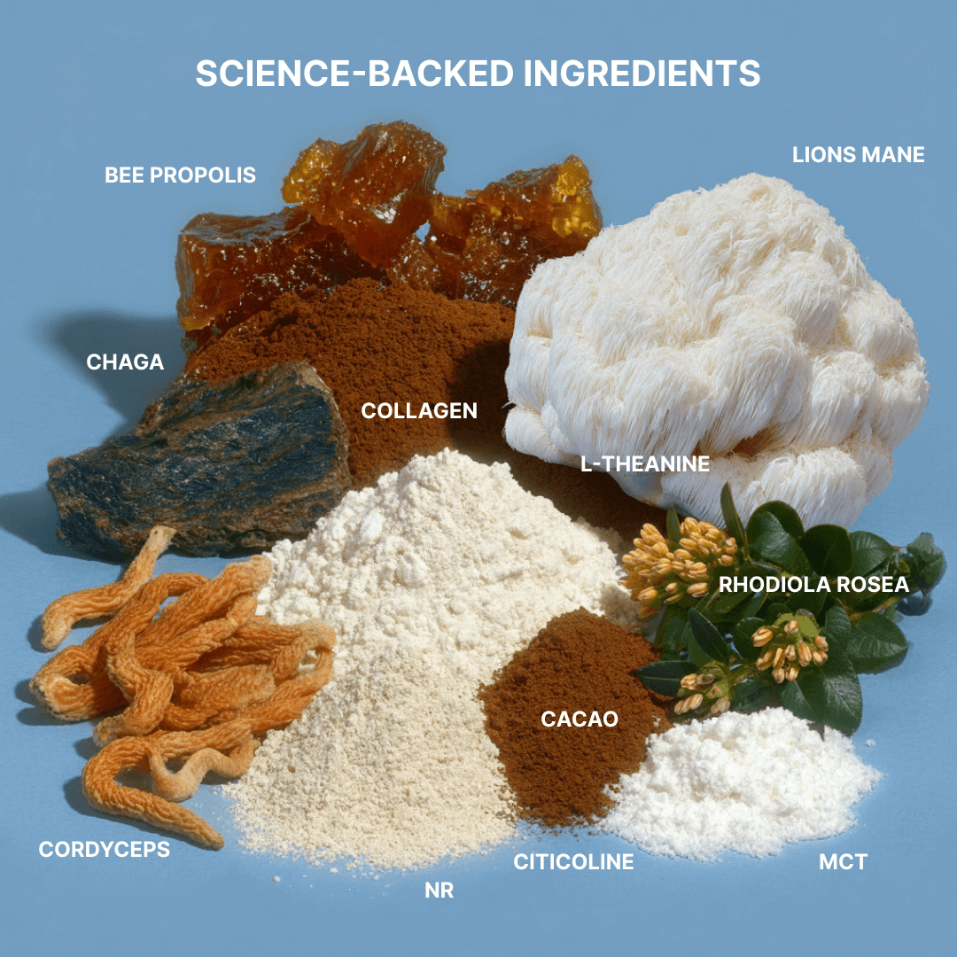 We're the only drink that combines functional mushrooms with NAD+ boosters to provide complete, sustained energy and longevity support. This synergy creates a powerhouse formula for optimal performance, cognitive function, and long-term health.