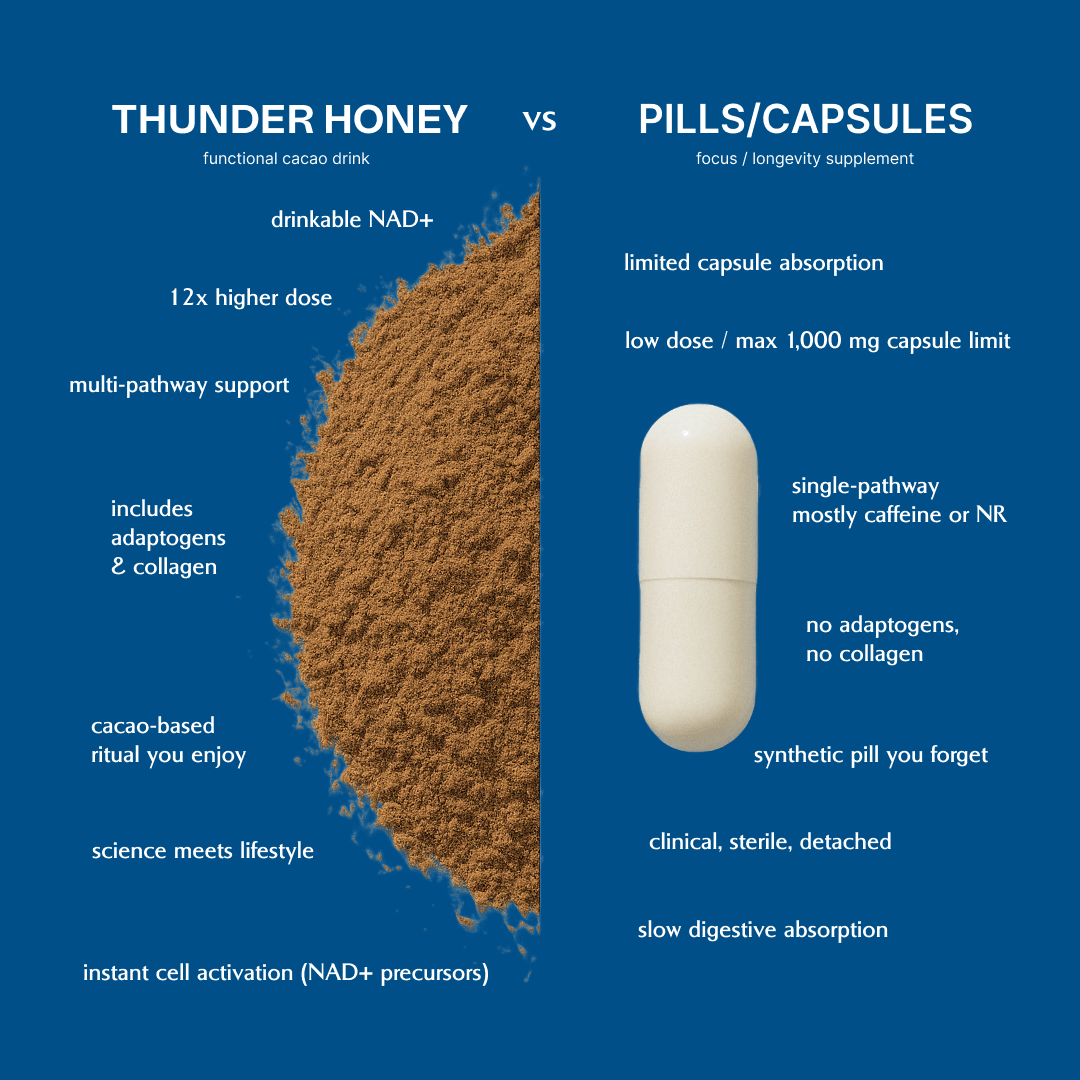 Ditch the crashes, jitters, and dependency. Thunder Honey gives you clean, focused energy - powered by mushrooms, NAD+ boosters, and zero caffeine.